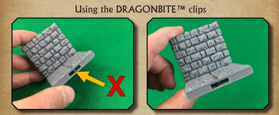 To connect the tiles, slide the dragonclip into the empty slot and slide the tiles together. Be sure to only apply pressure at the bottom of the tile and not push the walls as that may cause them to crack.