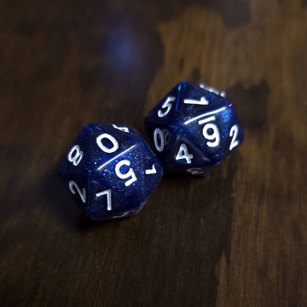 • Dual icosahedrons marked 0–09, for true d10 rolls.