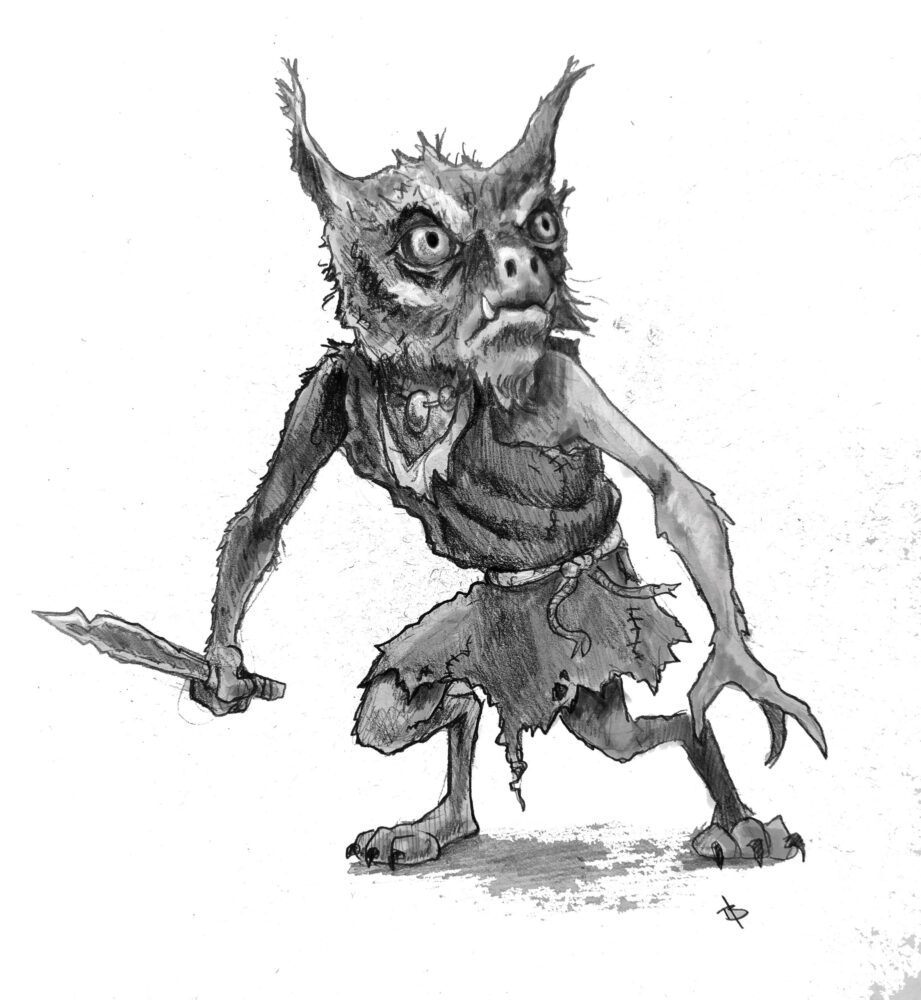 Drogga are small goblinoid creatures who live in deep caves or dark forests. They have canine traits, such as fur over most of their bodies, pointed ears, and a slight snout. They are often little threat to communities above ground, but if something drives them from their homes, they can become quite a nuisance. They collect, steal, and cherish objects that are shiny, luminous, or intricate. In fact, they will even be driven to violence to acquire something they find attractive.