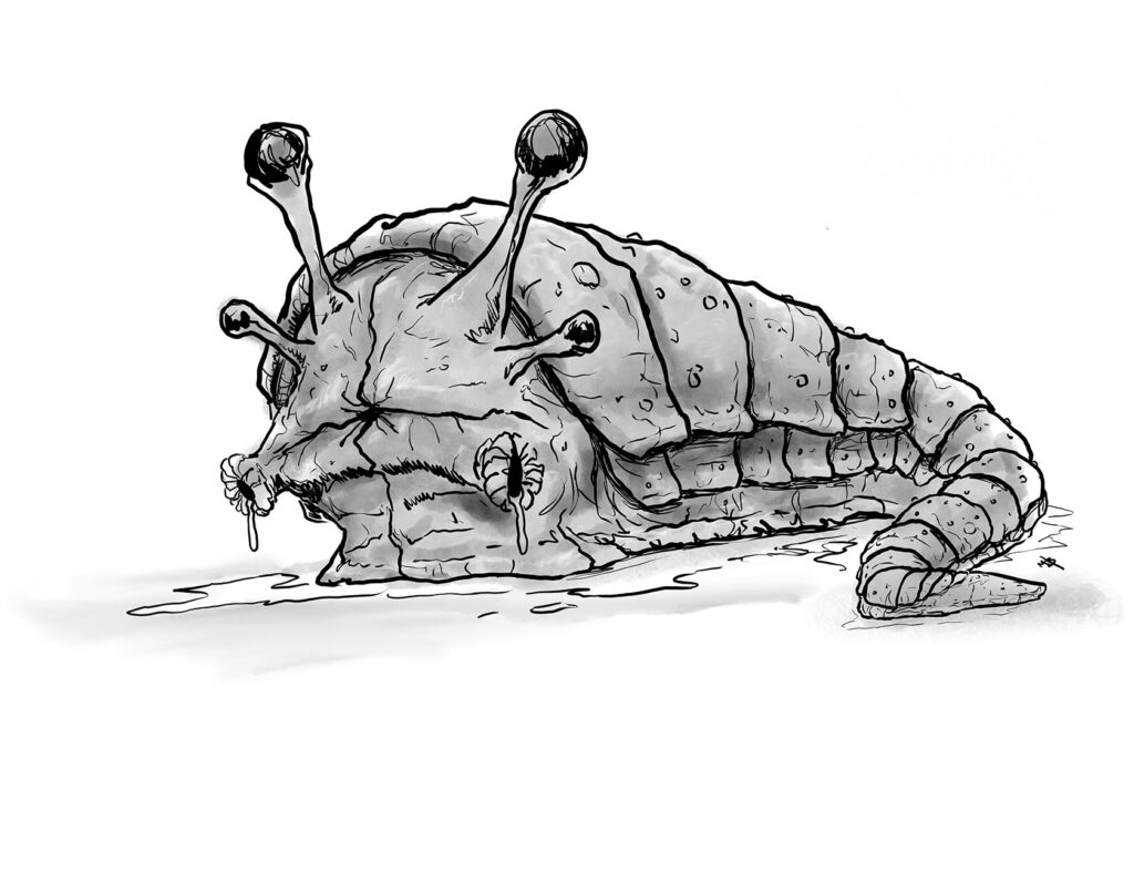 Gorgalugs, often called “tank slugs” by adventurers, are large creatures who live within the dark caverns and deep recesses of the earth. They burrow through solid stone by two means, both involving acid production: some from a gland under its mouth that it can spit precisely up to 30 feet, and the other secreted from pores all over the gorgalug’s body. They will normally make a lair in a giant cavern and attract prey by using a scented oil secreted from their bodies.