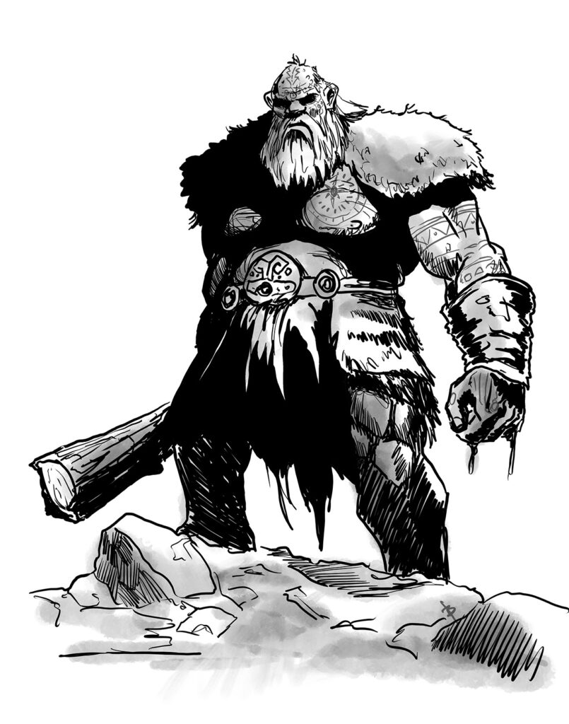 Hill giants are the most commonly encountered of the giants due to their larger numbers and closeness to human settlements. Their fecundity, relative to their other cousins, is high, which likely accounts for their greater comparative numbers. They worship Rom, possessing an inner rage that they see as holy. They adorn their bodies with deliberate scarification and elaborate tattoos to honor their god and, after a rite of adulthood, they dye their hands red to demonstrate their utter commitment to their beliefs.